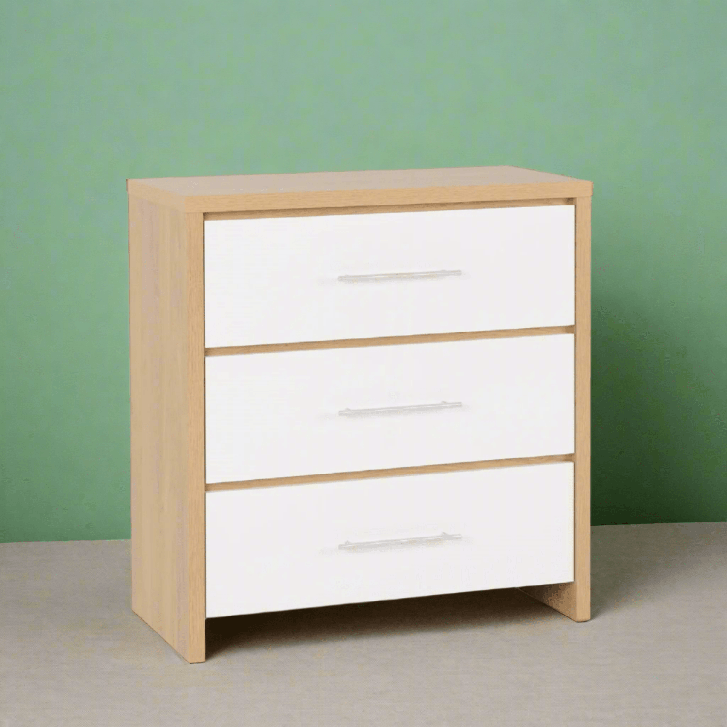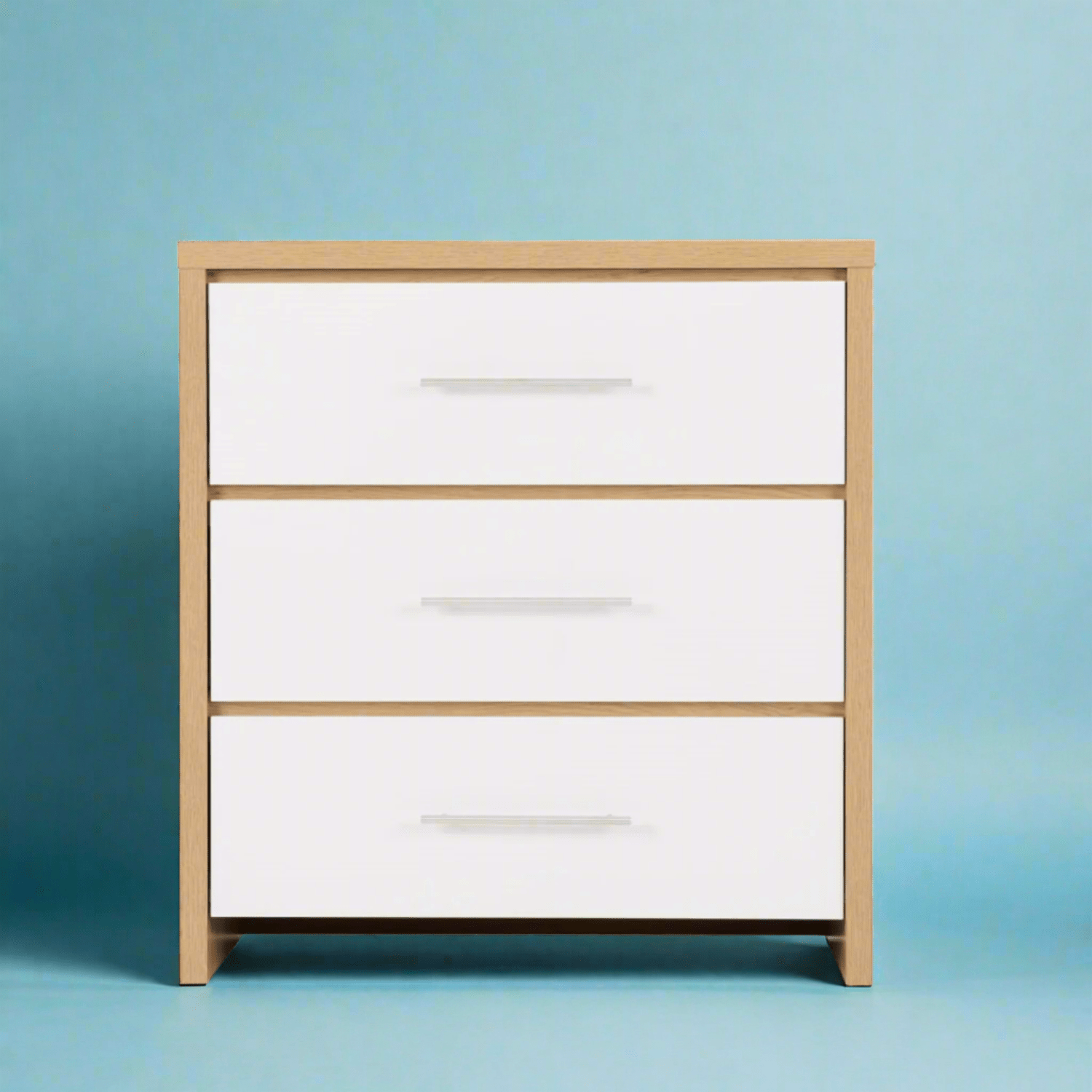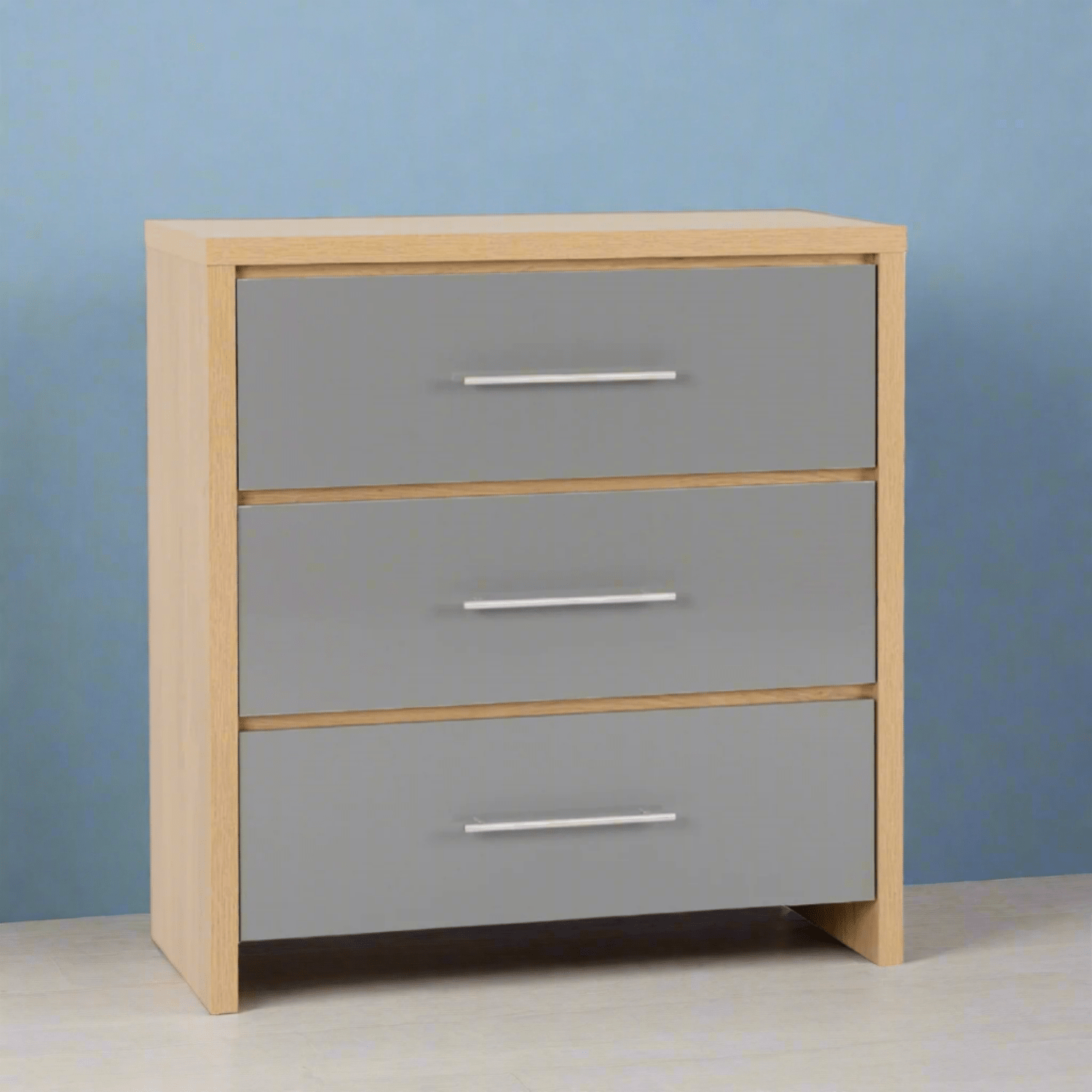 Add a sleek, two tone touch to your bedroom with the Santorini 3 Drawer Chest, available in a stylish light oak effect finish paired with a choice of high gloss white or grey drawer fronts. Designed to complement contemporary interiors, this compact and functional piece offers a balance of form and function, making it an ideal addition to any bedroom setup.