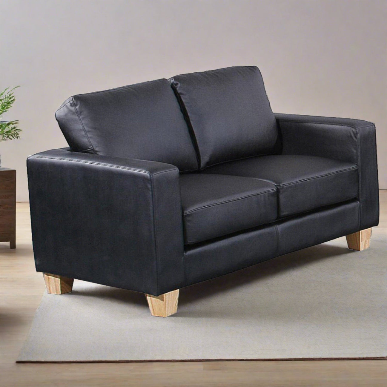 Faux leather sofa in a box. Square in style and shape which makes it a good choice for slotting into tighter/smaller spaces, reconfirmed by the petite size. Firm seats but softer back cushions.