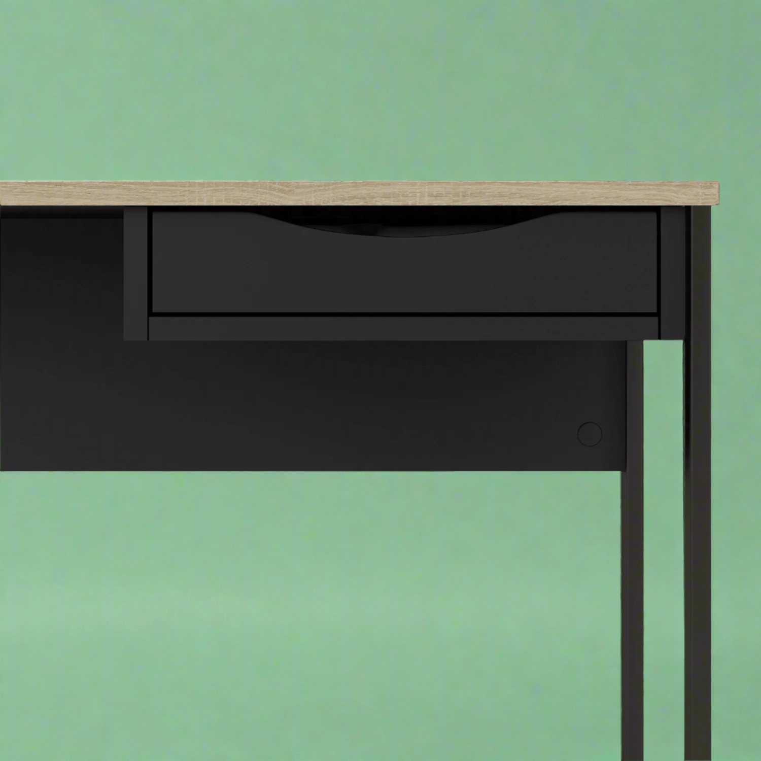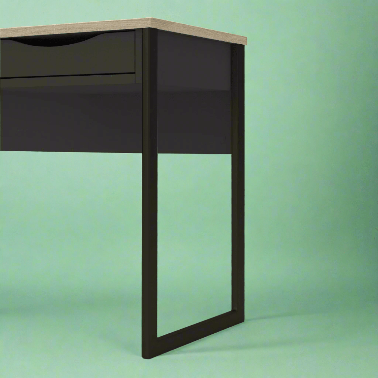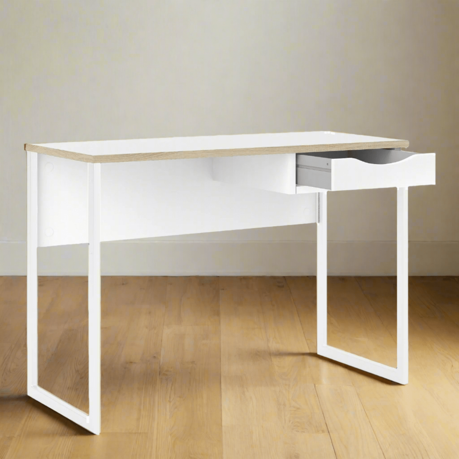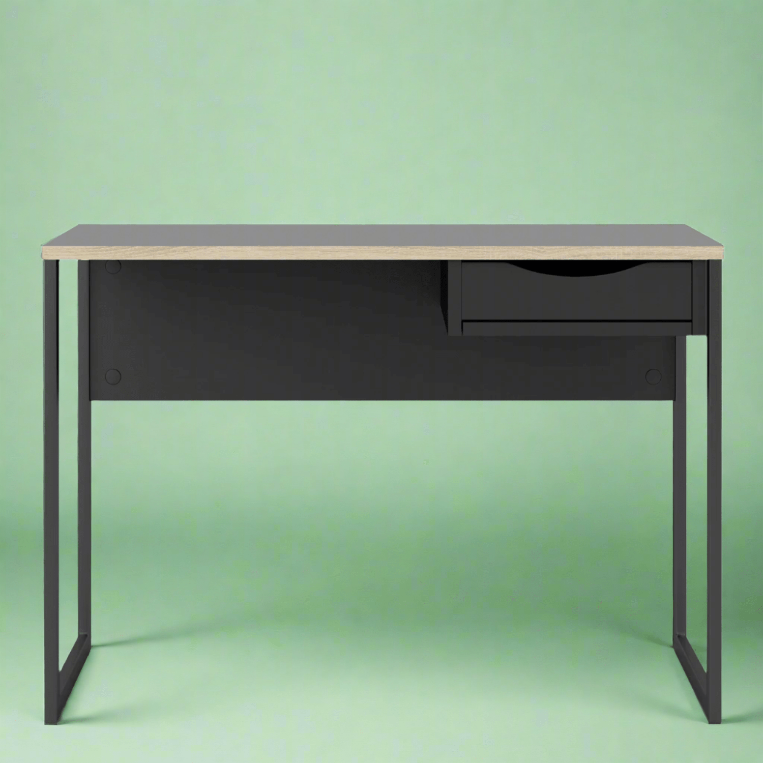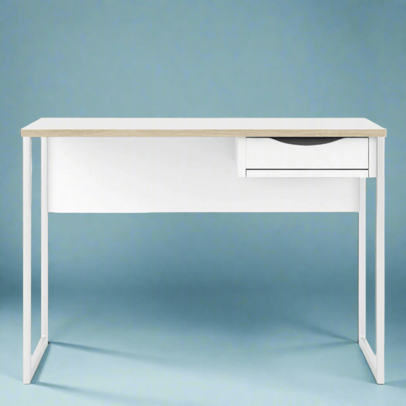 The Laminated Board 1 Drawer Desk, a minimalist design with 1 drawer made for spaces where 'bulky' furniture is too much. Featuring a fresh white/black finish with oak trim, it fits into any modern interior. It's metal open legs are bolted on for strength and to keep the space looking clear as well as the appearance of your room looking bigger.