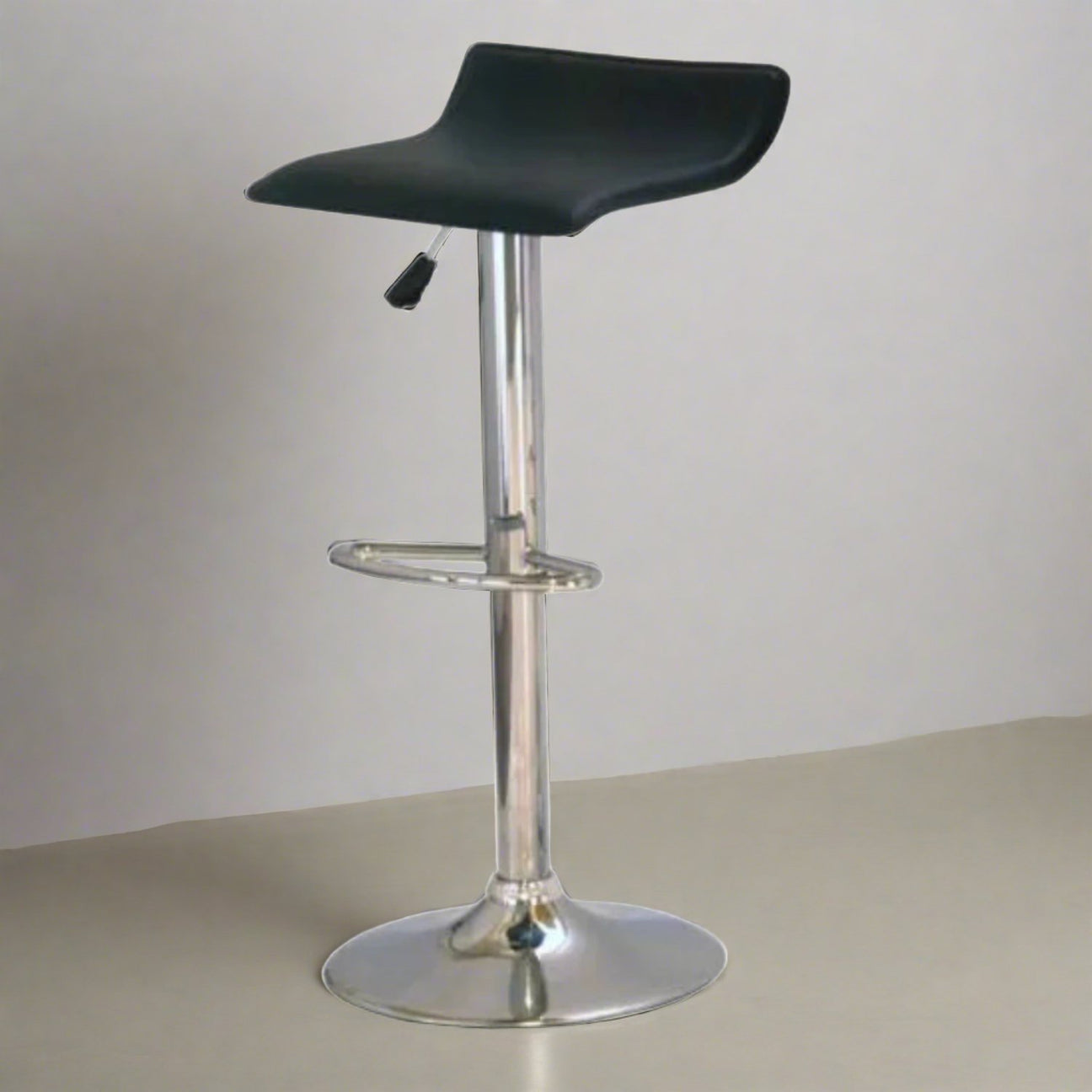 Contemporary style Chrome base and faux leather seat. Height adjustable bar stool at a low price. Containing a foot rest as a cosy spot for your feet, 360 swivel ability and a padded seat for comfort. Slots in seamlessly into any home with a breakfast bar or high table.