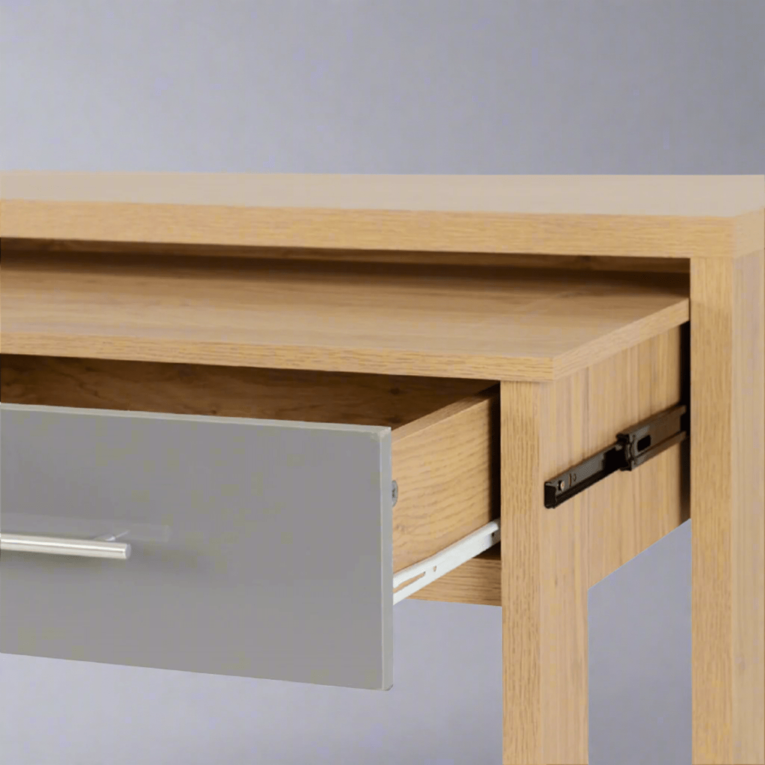 The desk is constructed from composite board, supported by an MDF back panel and drawer base. Two shallow drawers provide practical storage for stationery, notebooks, or small office essentials, helping to keep your workspace organised and clutter-free. The drawers open smoothly on robust metal runners and are finished with sleek metal handles to give the desk it's modern appeal.