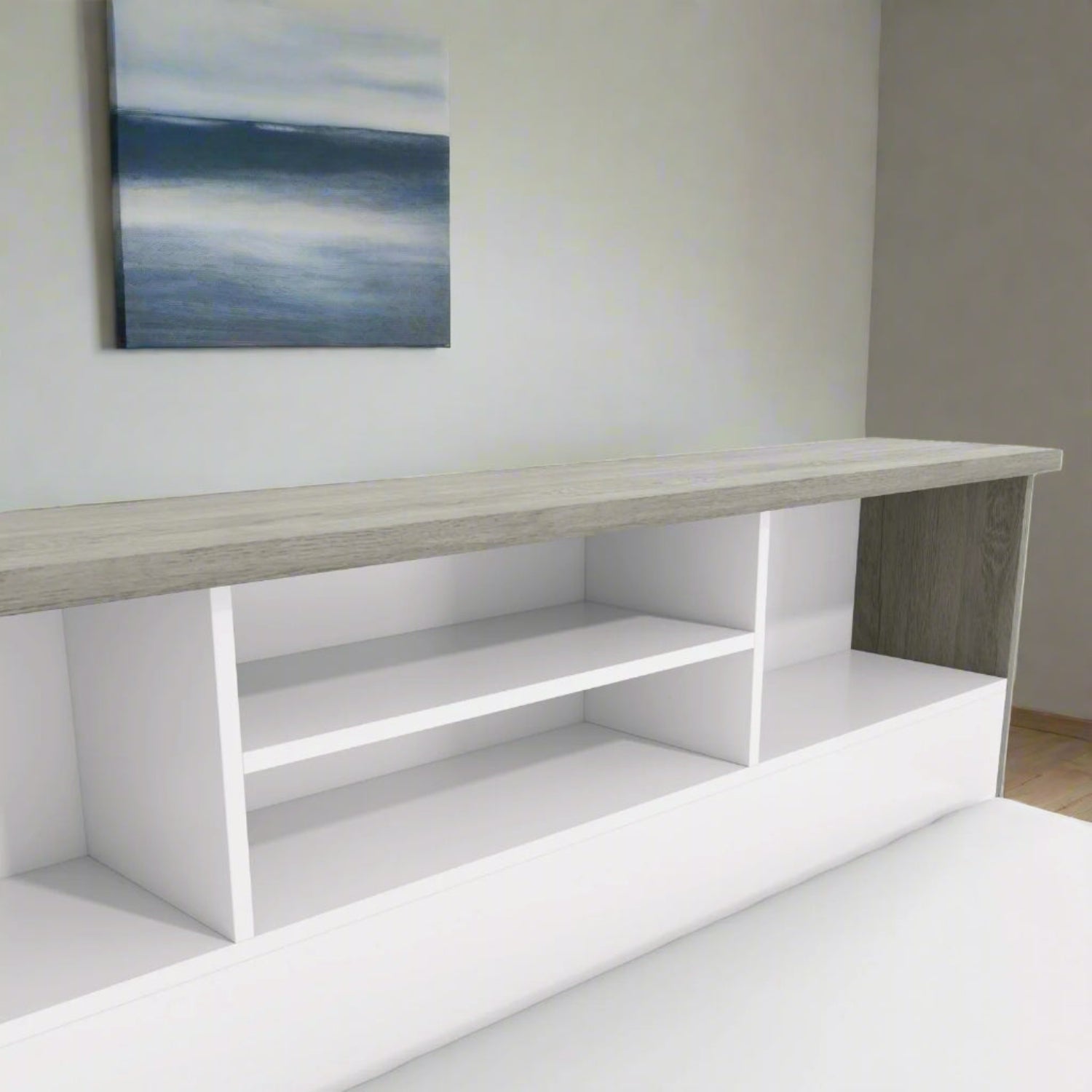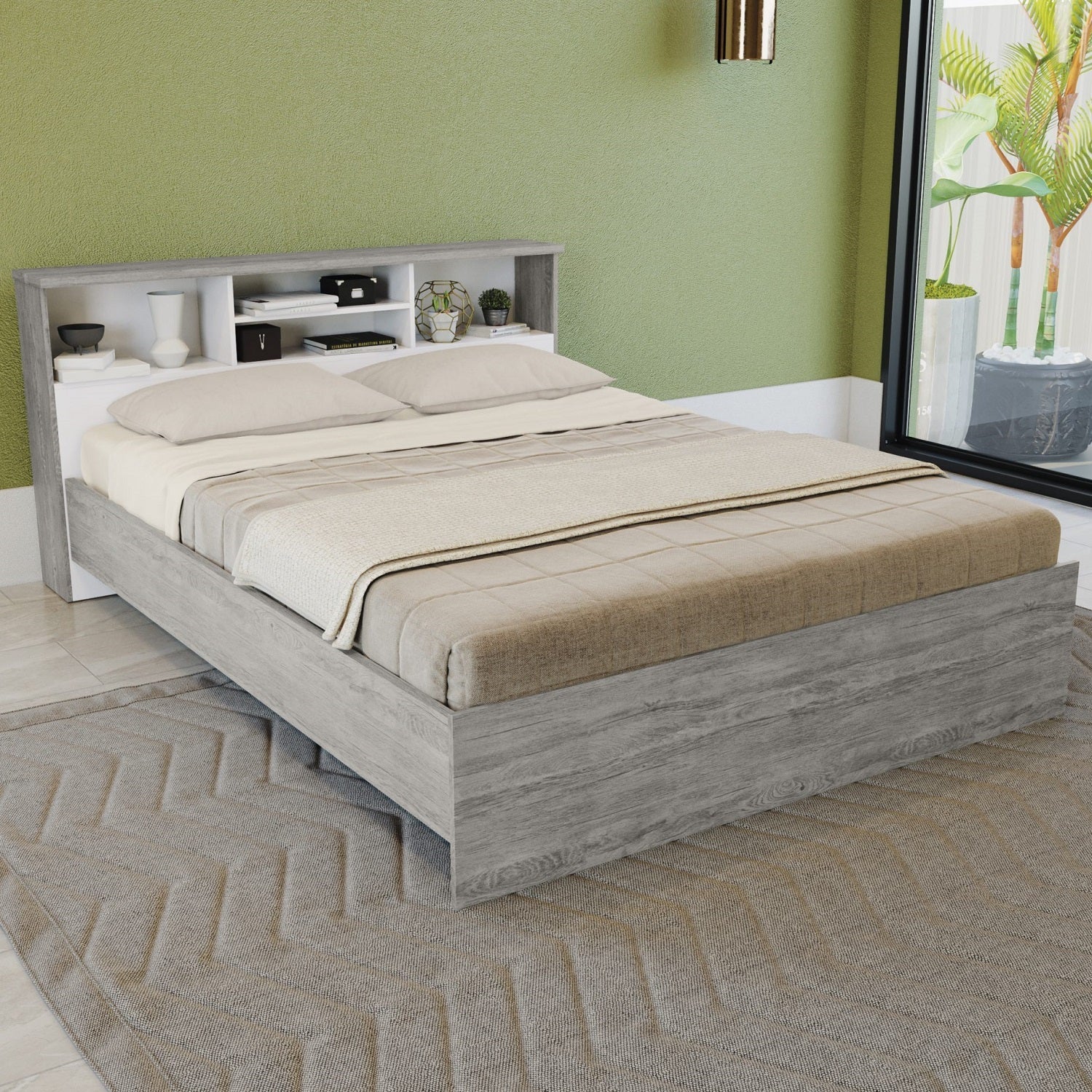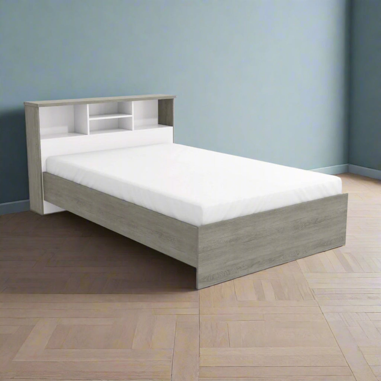 Melody Grey Oak Veneer Bed With Headboard Shelf