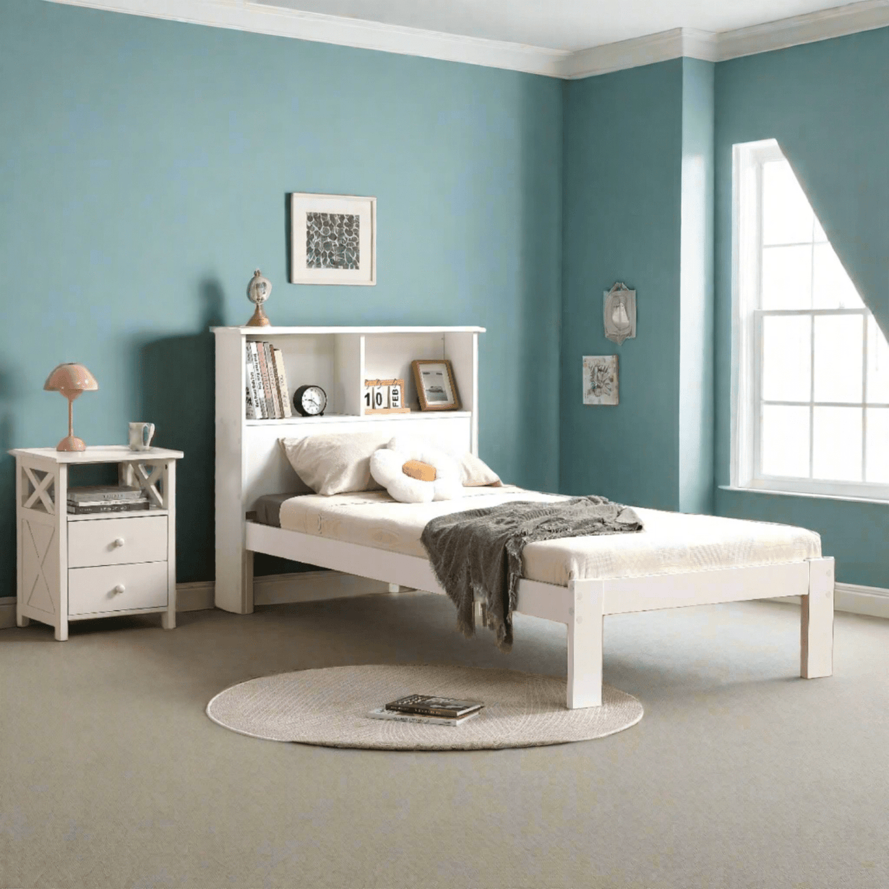 Maximise your bedroom space with the Easton Shelf Bed, an integrated shelving unit designed for practical modern living. The built-in shelf headboard features two spacious compartments, ideal for keeping books or bedside essentials within easy reach.