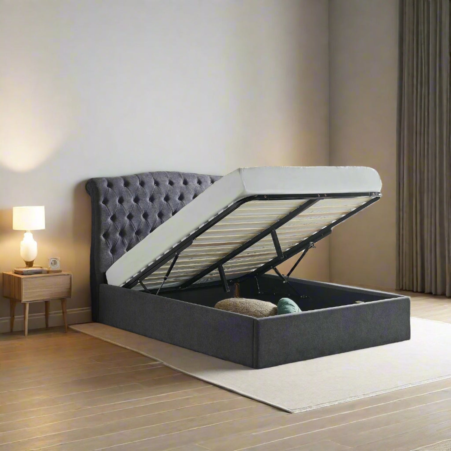 The Victoria Plush Chesterfield Ottoman Bed brings a classic look redefined with a modern finish, making it a classy addition for any bedroom. Upholstered in a plush velvet fabric with a beautifully detailed buttoned Chesterfield headboard, this bed offers a high quality finish and look without the price tag.