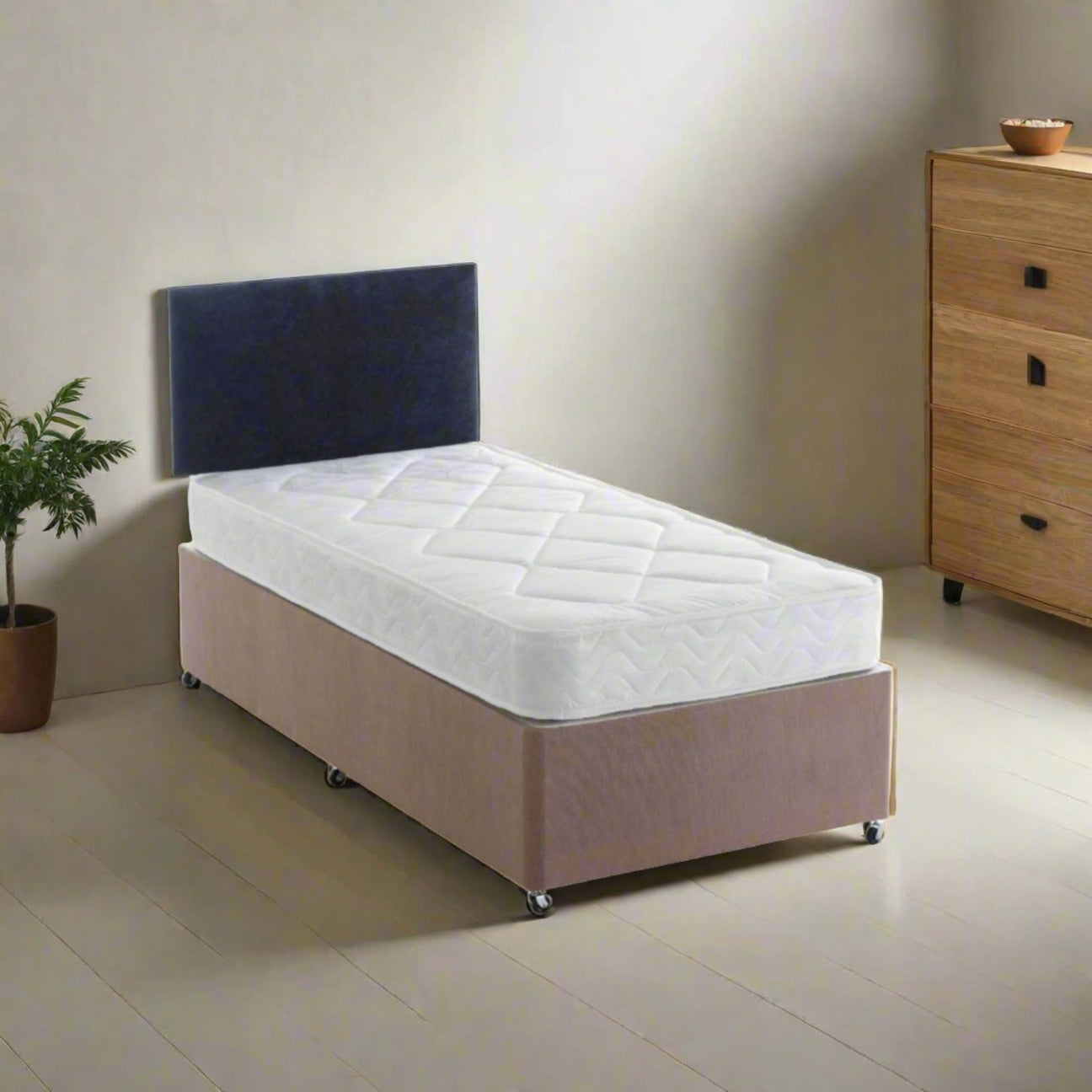 Classic style divan base. A quick no-nonsense bed solution. Minimal assembly, the divan base in this package is available with no drawers, 2 drawers and 4 drawers. The colour of the base in this package is Linen Style Sierra Grey as shown in the colour swatch picture.